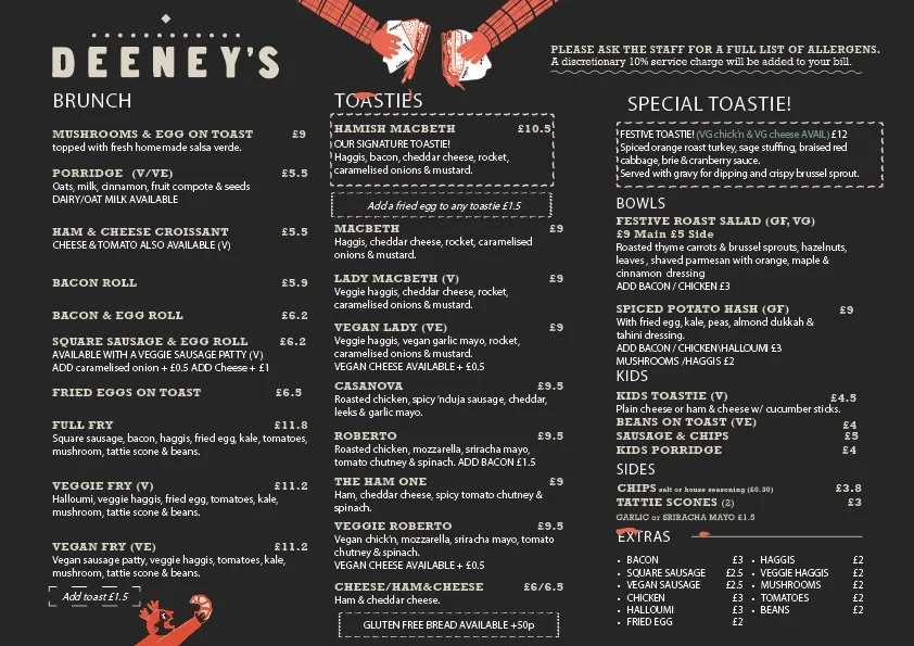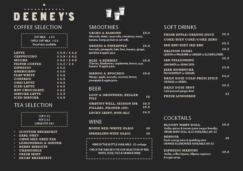 The Café serves a range of hot and cold drinks, sweet treats such as cakes and pastries, as well as bigger bites for when the lunchtime hunger hits. Deeney’s is famous for its selection of delicious toasties, namely the Deeney’s haggis toastie or ‘The Macbeth’ which has been described as “London’s best sandwich” by the Evening Standard, Time Out and Buzzfeed.